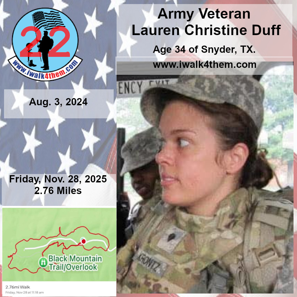 It was a great honor to hike 2.76 miles with Army Veteran Lauren Christine Duff. Our hike went great. The temp was a little cold but just right for the hike. We got to visit with several nice people and talk about what we were doing. It is a very special place and a part of my heart is their up on that Mountain. The views were spectacular today. We could see for miles and miles. It was a great hike. I want to thank my friend Dale for helping me honor this hero today. We did not get any honks today since we were out on a hike. I also want to thank Army SPC Jordan Neal for helping us honor this hero today as well. It was just spectacular.