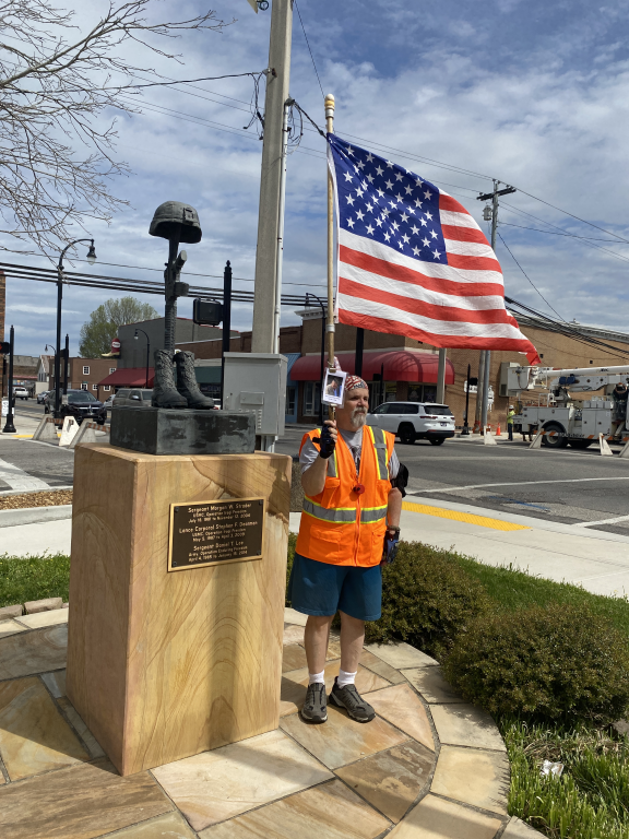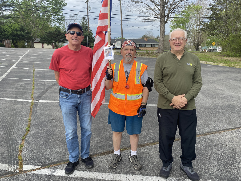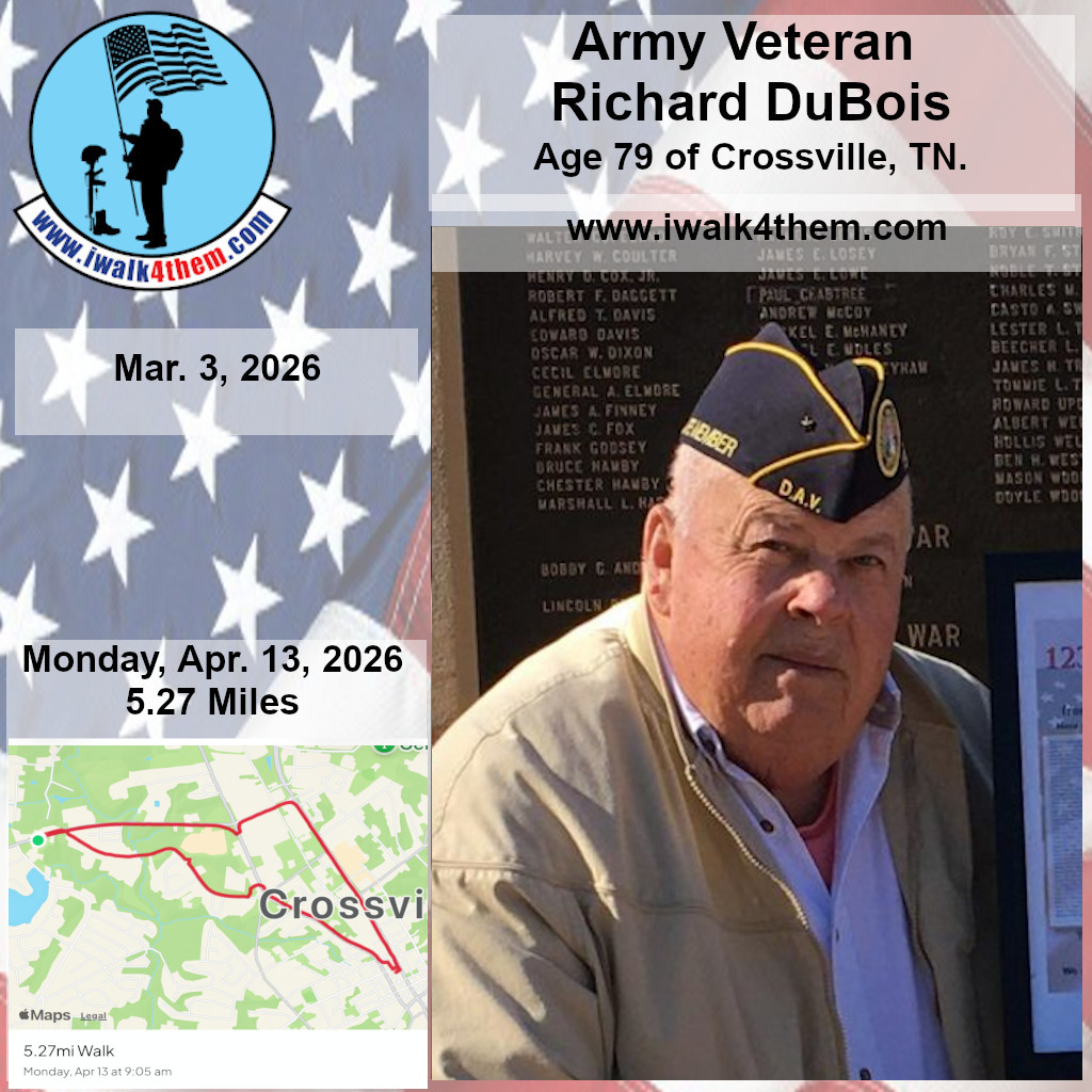 I have known Richard for around 20 years. It was a great honor to walk 5.27 miles with Army Veteran Richard DuBois today. We started out walking down Sparta Drive and made a stop in at the DAV Office where Richard was the Commander for several years. We met up with Jeff and Jeff their. We then walked up town to the Veterans Memorial Park. We had a great walk. I want to thank my friend Bob for walking with us today. Bob, Jeff, and Jeff all knew Richard. Thank you all for helping me honor this hero today. I also want to thank everyone who honked, waved, and saluted in helping me honor this hero. We had 217 honks. It was amazing. I also want to thank SPC Jordan Neal for joining us today and helping us honor this hero.