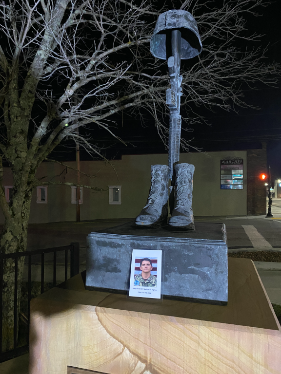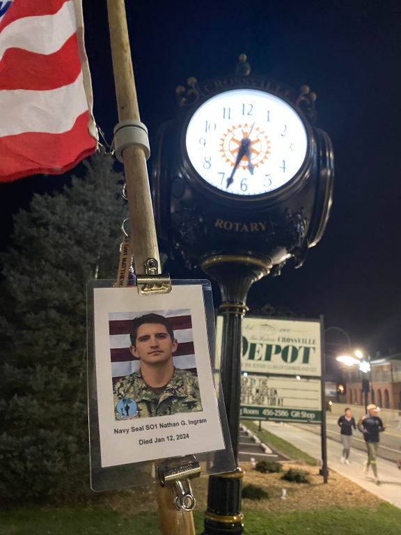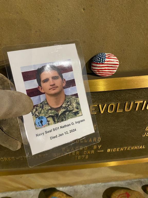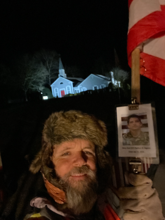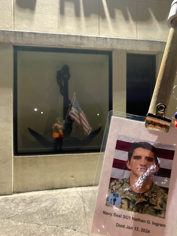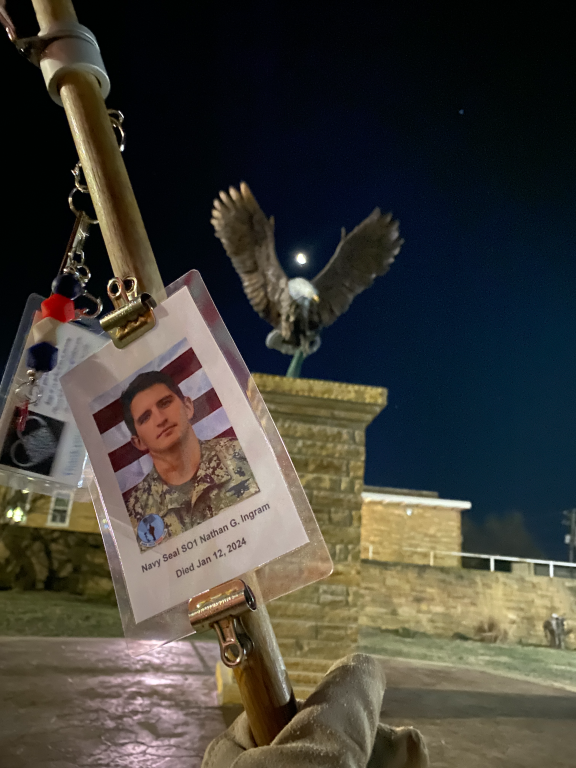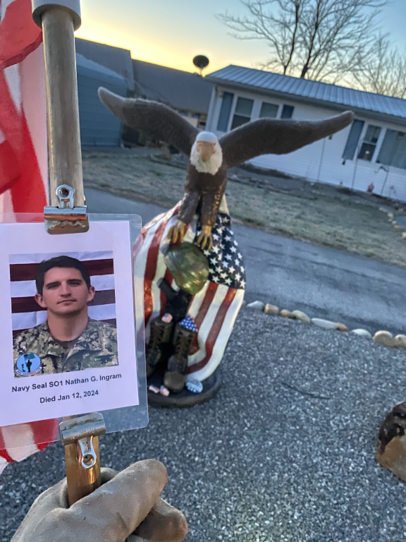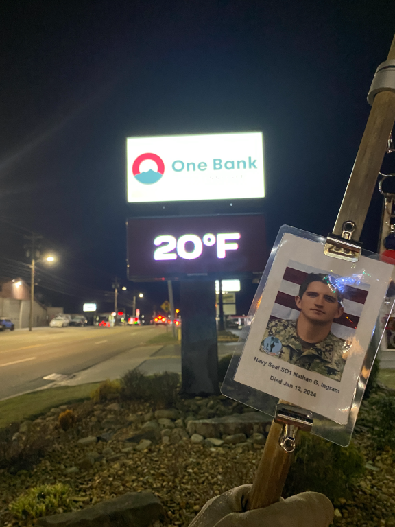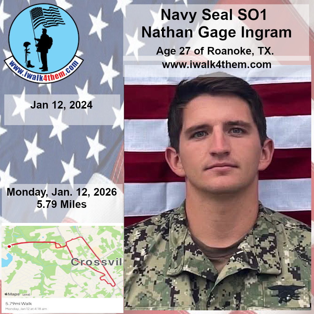 It was a great honor to walk 5.79 Miles with Navy Seal SO1 Nathan Gage Ingram. We headed out early this morning. It was a brisk 19 deg. when we headed out the door. We walked West Ave and then cut over and made a stop by Boats and Harbors and walked by the Fire Station. We then headed north on Main Street and made a stop in at the War Memorial Park. We caught a glimps of the moon in our eagle photo. We also found a painted rock and kept it and will add it to our Memorial Area in honor of Nathan. We then continued our walk north and walked by the train depot then headed back towards the house. The sun was just starting to rise when we made it home. I want to thank everyone who honked, waved, and saluted in helping us honor this hero. We had 75 honks this morning. It was amazing. Thank you. I also want to thank Navy GM1 Matthew Austin for helping us honor this hero today.