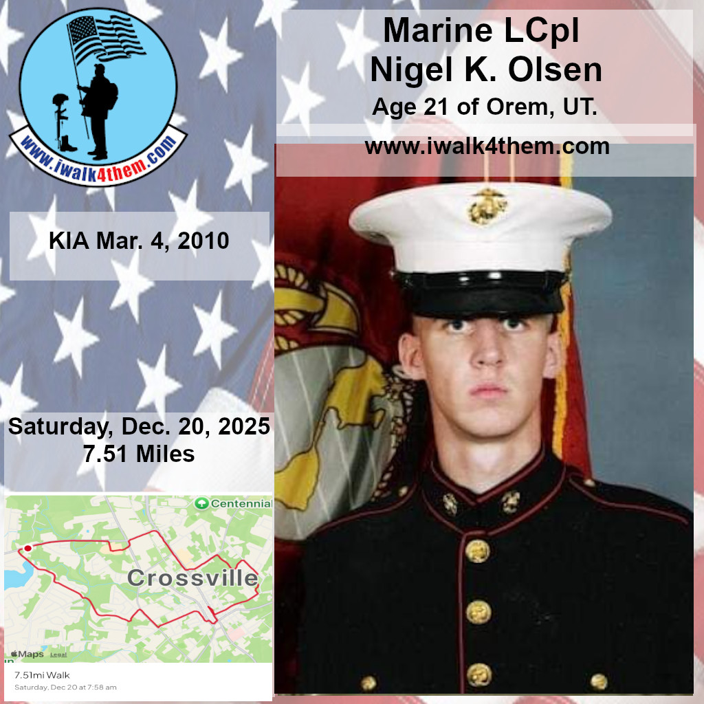 Order Pregabalin OnlineBuy Valium 10 Mg Online It was a great honor to walk 7.51 Miles with Marine LCpl Nigel K. Olsen. We walked by Holiday Hills Lake on our way to town. We walked by the fire station before making a stop in at the Veterans Memorial Park. We read several names of our Fallen Brothers on the Memorial Wall . We then made our way out to the Crossville City Cemetery where we visited several of our Fallen Brothers. We made our way back to main street and turned at the Bakery and headed back to the house. I want to thank everyone who honked, waved, and saluted in helping me honor this hero. It was amazing. We had 294 honks. Thank you. I also want to thank Army Veteran Codey Donahue for helping us honor this hero today.