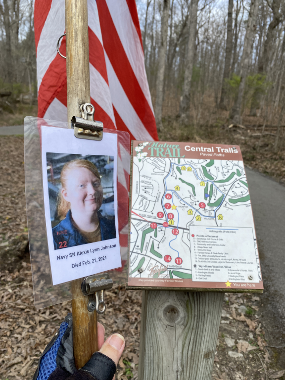 It was a great honor to hike 1.98 Miles with Navy SN Alexis Lynn Johnson today on the Centrail Paved Trail in Fairfield Glade, TN. This trail was paved and very active trail. We seen several people walking with their dogs. Several views of the lakes. Their was even a tunnel going under the highway. It was a great hike. It was even connected to a small sculpure trail that was very interesting. I want to thank Donna and Candy for helping me honor this hero today. We really had a great hike. I also want to thank these heros for helping us honor this hero today.