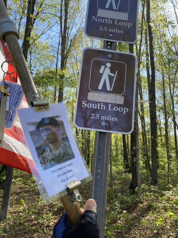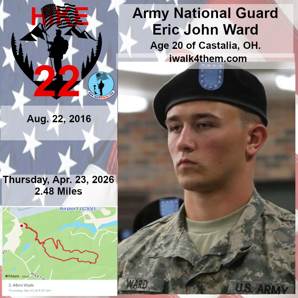 It was an honor to hike 2.48 miles with Army National Guard Eric John Ward today. We hiked the Airport South Loop Trail today. The weather was perfect and the trail was very beautiful. I want to thank Candy for helping me honor this hero today. I also want to thank SPC Jonathan Bryant for joining us and helping us honor this hero today. It was amazing.