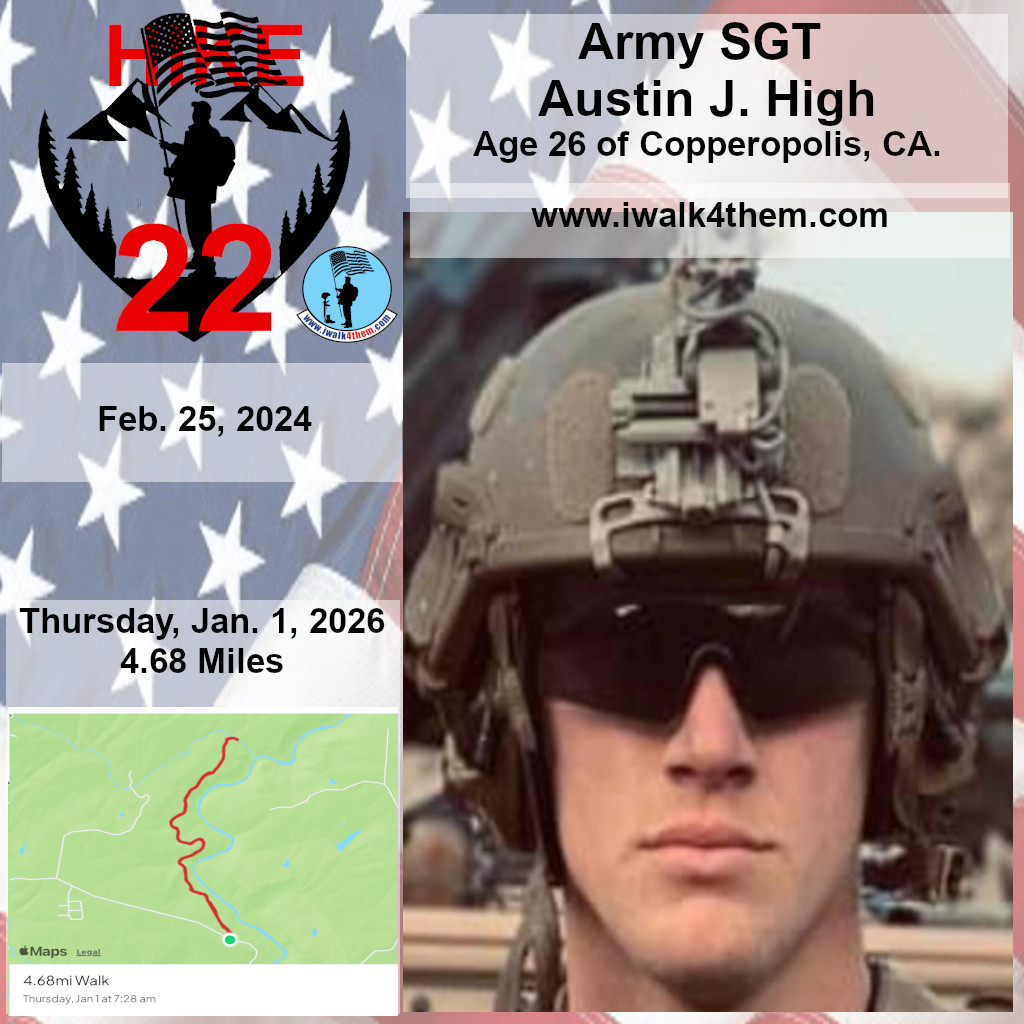 It was a great honor to hike 4.68 miles today with Army SGT Austin J. High. Today we hiked The McGinnis Trail. It was a walk in and then back out type of trail. It was amazing. We ran into 7 other people on the trail and got to talk about what we were doing. It was such a beautiful trail to start the year off right. I want to thank Candy and Donna for helping me honor this hero today. This was our 5th hike of 22 hikes this winter to bring awarness to Veteran Suicide. I also want to thank these heroes for helping us honor this hero today as well.