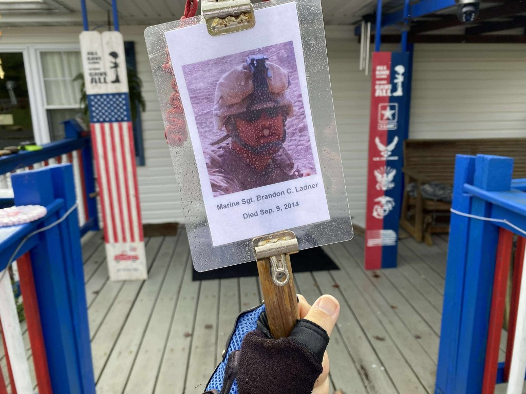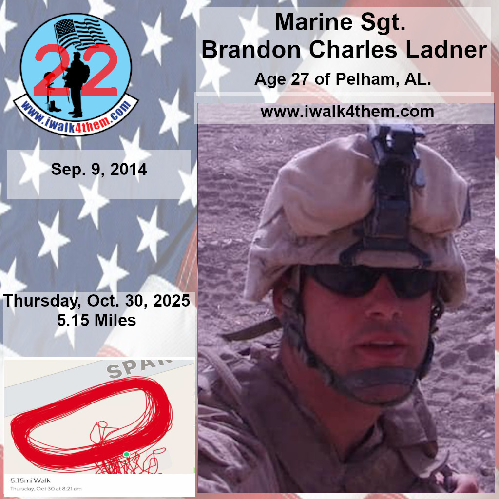 https://martonepsych.com/about/ It was a great honor to walk 5.15 Miles today with Marine Sgt. Brandon Charles Ladner. We didn’t let some cold rain stop us. We walked anyway. It was about 42 deg. when we headed out on our walk this morning and the rain was coming down. We had a great walk. We even had a jet fly over the house. I want to thank everyone who honked, waved, and saluted in helping me honor this hero. We had 267 honks today. It was amazing. I also want to thank Marine CPL Wyatt Hatcher for joining our walk and helping us honor this hero.