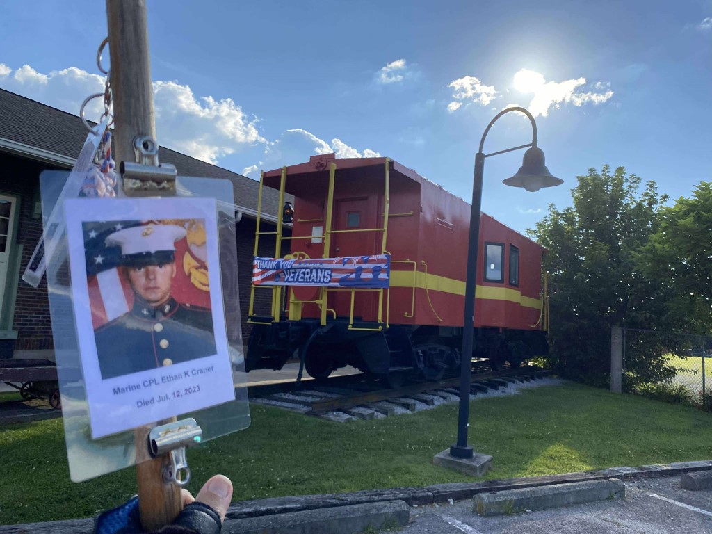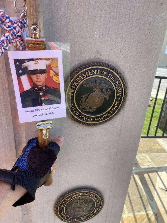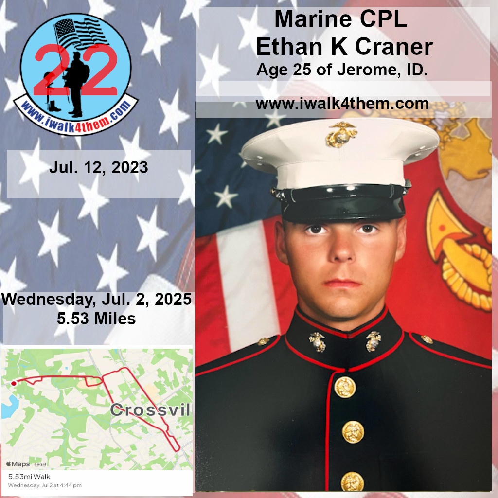 It was a great honor to walk 5.53 Miles with Marine CPL Ethan K Craner today. We did an evening walk today. We left the house and headed down West Ave. We walked to Lantana Road and then turned back north on Main street. We made a stop in at the Veterans Memorial Park where we read some names of our Fallen Brothers on the Memorial Wall. We spent some time in the park just reflecting and enjoying the moment. We then made a stop in at the Train depot. We walked north till we got to the Bakery and then before heading back toward the house we stopped in at the Frost Cemetery to visit some of our Fallen Brothers. I want to thank everyone who honked, waved and saluted in helping us honor this hero. We had 382 honks today. It was just amazing how many of you waved and even had a few yell out their window and thanked me. And yes, I did see you bother and thank you. I seen a Vietnam Veteran walking on one of the side roads and he stopped and saluted us from a distance. I want to thank GM1 Matthew John Austin for helping us honor this hero today.