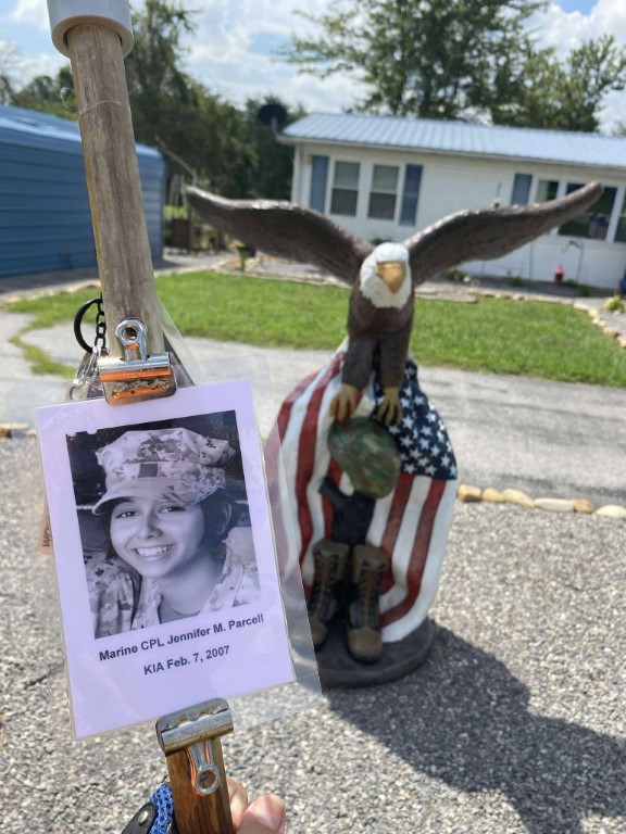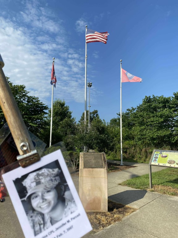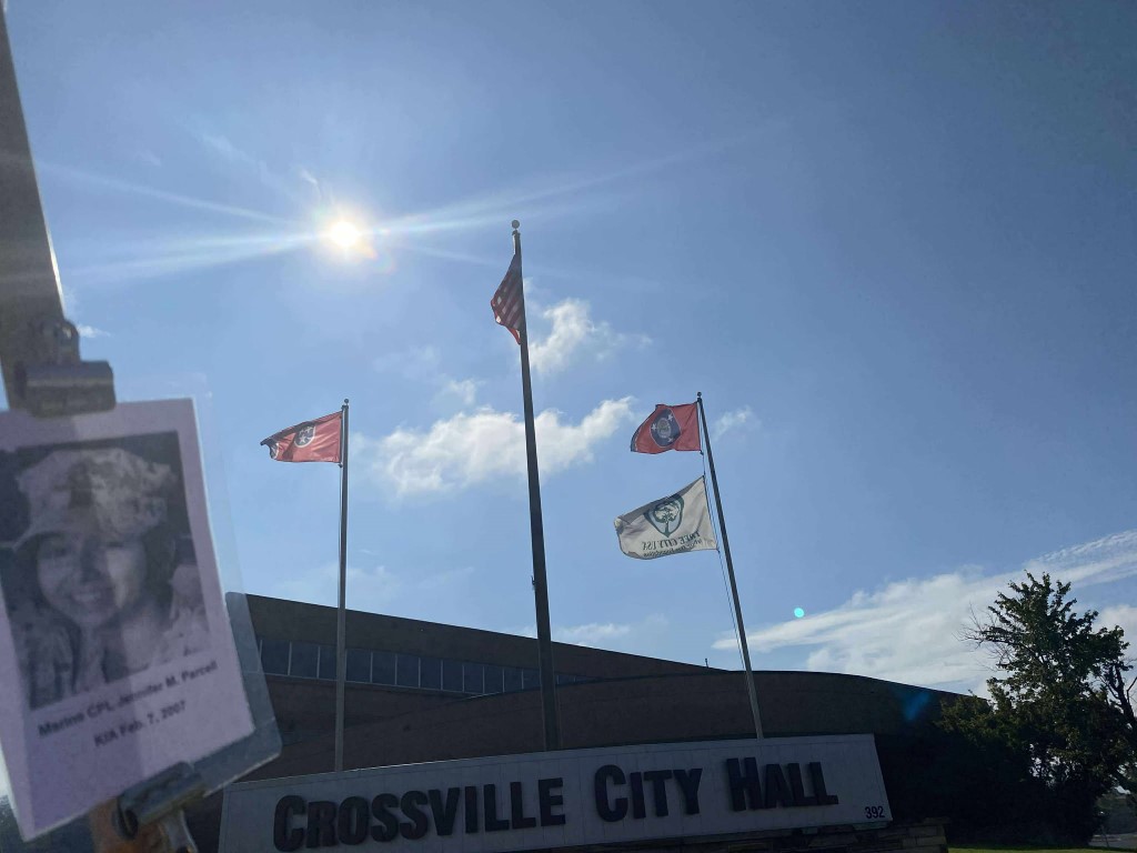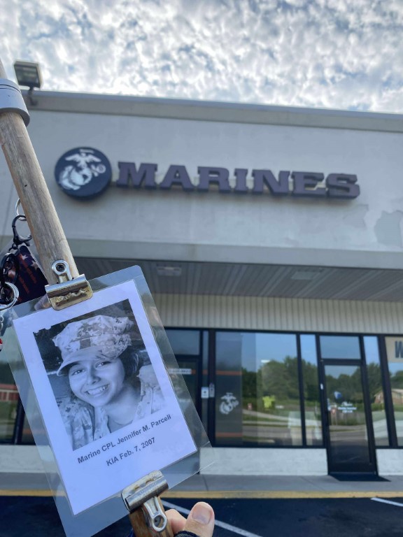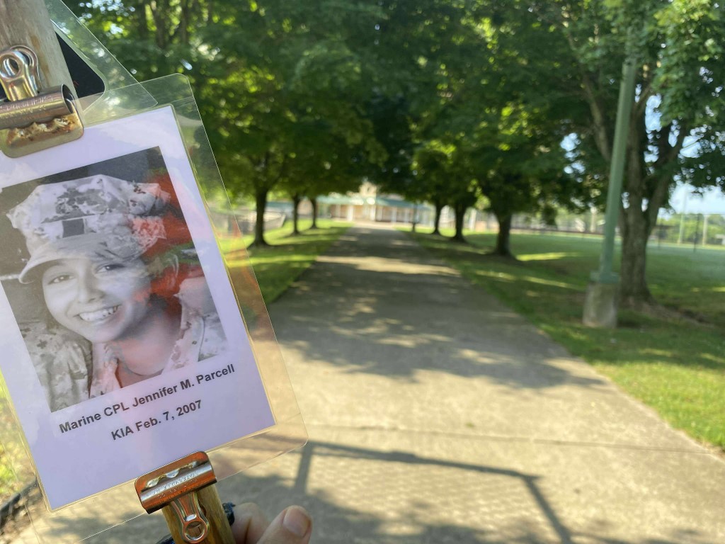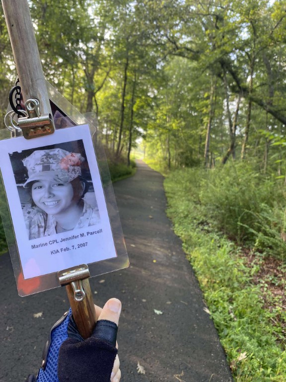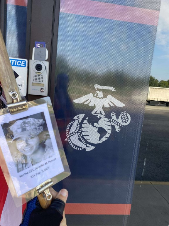 It was a great honor to walk 11 miles with Marine CPL Jennifer M. Parcell. We walked out on Northside Drive and worked our way over to the Obed River Park. It was nice walking by the water and feeling the breeze. We came out on 127 and worked our way over to the Crossville Centennial Park and enjoyed our walk through the park. We came back out to 127 and headed towards town. Our next stop was the Veterans Memorial Park where we read several names of our fallen brothers and the Memorial Wall. We then took West Ave and headed back towards the house. I want to thank everyone who honked, waved, and saluted in helping me honor this hero. We had 428 honks. It was amazing. I also want to thank Marine SGT Ryan Isom for joining us on our walk and helping us honor this hero.
